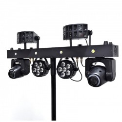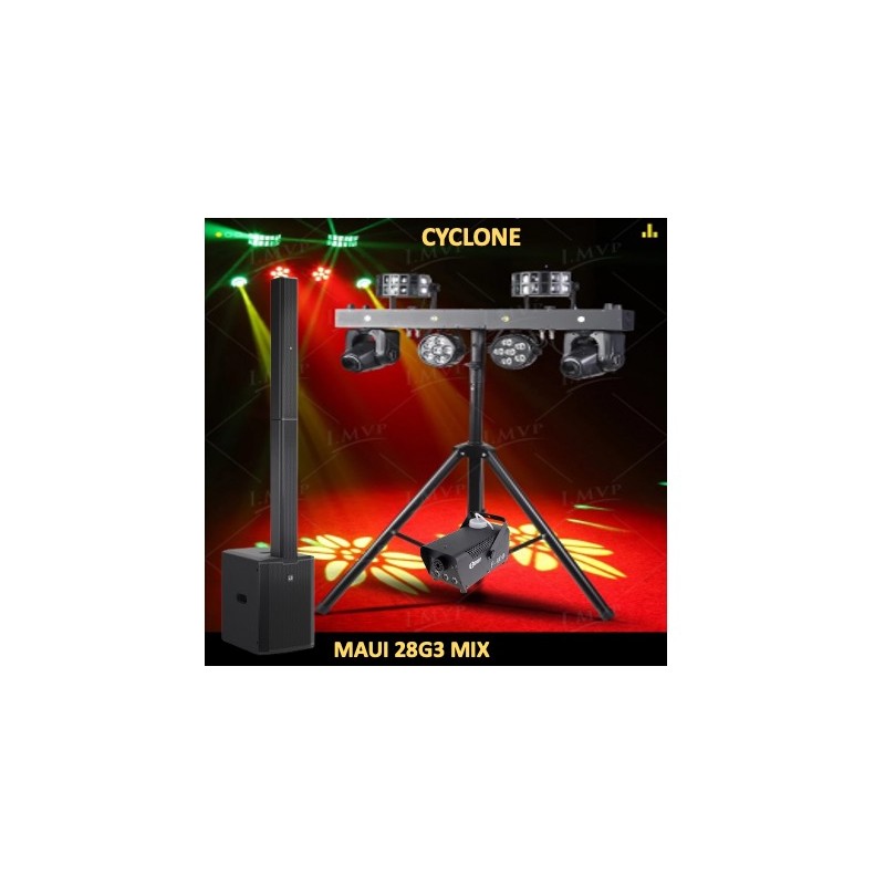 Colonne de son amplifiée trés performante avec caisson de basses pour une puissance totale de plus de 1000 watts haut rendement ouverture 120°, avec la possibilité de brancher 2 micros, 1 dj, 1 ordinateur et bluetooth et un pack light cyclone ( barre avec 2 lyres led, 2 effet derby, 2 projecteurs led rgbw, 2 strobes led ) et machine à fumée, pied d'éclairage et cablages.